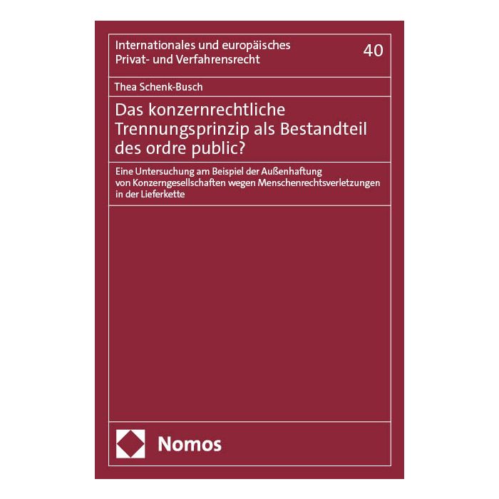 Das Trennungsprinzip schützt Konzerngesellschaften vor Haftungsrisiken ihrer Tochtergesellschaften. Bei Menschenrechtsverletzungen in der Lieferkette können sich Betroffene regelmäßig nur an die unmittelbar verantwortliche Tochtergesellschaft wenden. Das deutsche LkSG hat Unternehmen rechtsträgerübergreifende Sorgfaltspflichten auferlegt. Eine Außenhaftung für Sorgfaltsverstöße hat der Gesetzgeber ausdrücklich abgelehnt. Vor diesem Hintergrund untersucht die Arbeit die Frage, ob das konzernrechtliche Trennungsprinzip durch den deutschen ordre public geschützt wird. Zu diesem Zweck analysiert die Verfasserin aktuelle rechtspolitische und rechtsvergleichende Aspekte. Die Arbeit schließt mit einer Bewertung der aufgearbeiteten Argumente.