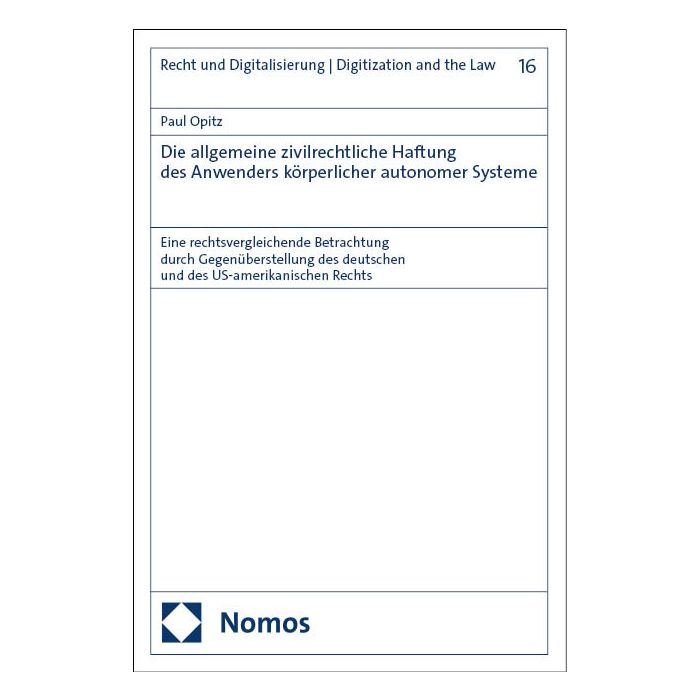 Die Arbeit behandelt vertrags- und deliktsrechtliche Haftungsfragen für körperliche autonome Systeme und nimmt dabei die Haftung des Anwenders in den Blick. Die spezifischen Risiken autonomer Systeme führen die traditionellen Haftungsregelungen an ihre Grenzen. Ob neue Regelungen nötig sind und wie diese aussehen könnten, wird anhand einer rechtsvergleichenden Betrachtung des deutschen und des US-amerikanischen Rechts erörtert. Dabei definiert die Arbeit wesentliche Begrifflichkeiten, erläutert die spezifischen Risiken autonomer Systeme und berücksichtigt Besonderheiten der „Industrie 4.0“. Abschließend zeigt die Arbeit Lösungsansätze für den Gesetzgeber auf, wobei das Hauptaugenmerk auf der Einführung eines neuen Gefährdungshaftungstatbestands liegt.