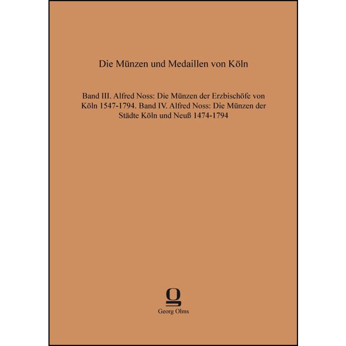 | Untertitel | Band III: Alfred Noss, Die Münzen der Erzbischöfe von Köln, 1547-1794. Band IV: Alfred Noss, Die Münzen der Städte Köln und Neuß, 1474-1794 |