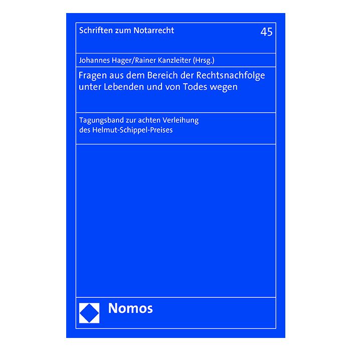 Am 20. November 2015 fand die 8. Verleihung des Helmut-Schippel-Preises im Rahmen eines Symposiums mit dem Thema „Fragen aus dem Bereich der Rechtsnachfolge unter Lebenden und von Todes wegen“ statt. Der vorliegende Tagungsband enthält die schriftliche Fassung der Beiträge dieses Symposiums.