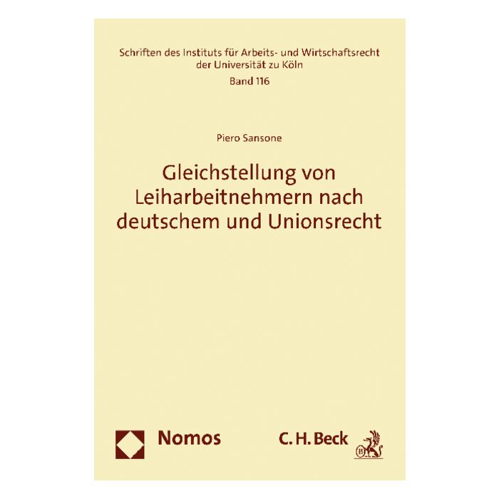 Die Dissertation von Piero Sansone stellt Inhalt, Ausnahmen und Rechtsfolgen der nationalen Regelung des Gleichstellungsgrundsatzes dar. Neben dieser „Bestandsaufnahme“ des geltenden Rechts werden die Auswirkungen der bis zum 5.12.2011 umzusetzenden Richtlinie 2008/104/EG über Leiharbeit auf die deutsche Normierung des Gleichstellungsgrundsatzes untersucht, die in Art. 5 einen auf den ersten Blick vergleichbaren „Grundsatz der Gleichbehandlung“ von Leiharbeitnehmern enthält.