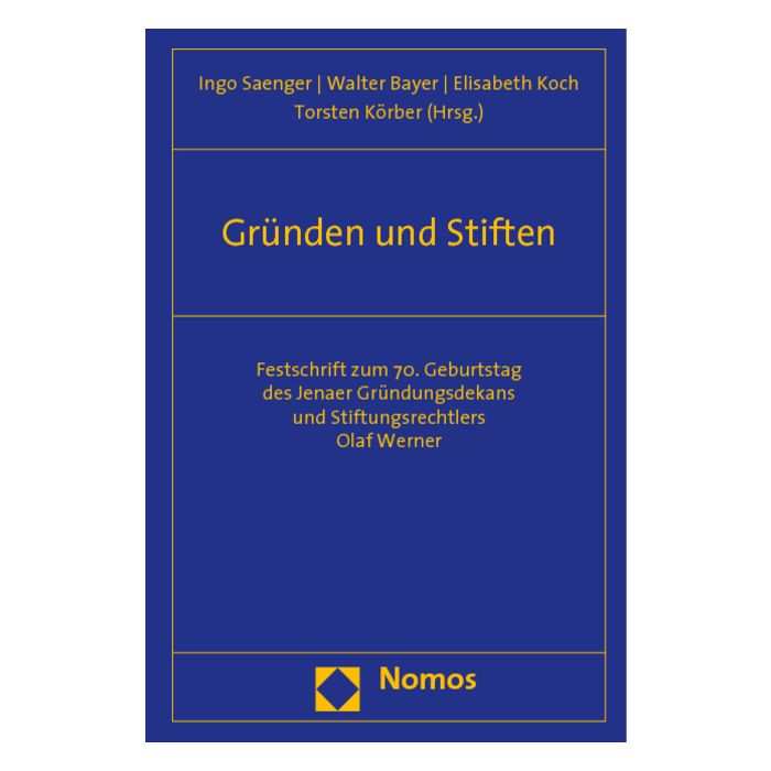 Olaf Werner, Jenaer Gründungsdekan und vormaliger Vorsitzender des Deutschen Juristen-Fakultätentages, vollendete am 18. August 2009 das 70. Lebensjahr. Der Jubilar, der über viele Jahre den Gesprächskreis Stiftungsprivatrecht im Bundesverband Deutscher Stiftungen leitete, entfaltet heute vielfältige Aktivitäten. Er ist geschäftsführender Direktor des Ernst-Abbe-Instituts für Stiftungswesen und prägt das Stiftungsrecht nachhaltig. Anlässlich des Jubiläums ehren ihn mehr als 50 Wissenschaftler und Praktiker mit einer Festschrift, die im Schwerpunkt das Stiftungsrecht in all seinen Facetten abdeckt. Namhafte Stiftungsrechtler analysieren stiftungsrechtliche Grundlagen und greifen Streitfragen etwa zur Stiftungsgründung und -struktur auf. Auch internationale Bezüge finden Berücksichtigung. Weitere Aufsätze aus dem Zivil- und Wirtschaftsrecht spiegeln die Interessengebiete von Olaf Werner. Dazu zählen das Vereins-, Erb- und Sachenrecht, ebenso wie das Prozess- und Insolvenzrecht. Themen mit Bezug auf die deutsche Vereinigung finden sich etwa zur Rückführung von Raub- und Beutekunst.