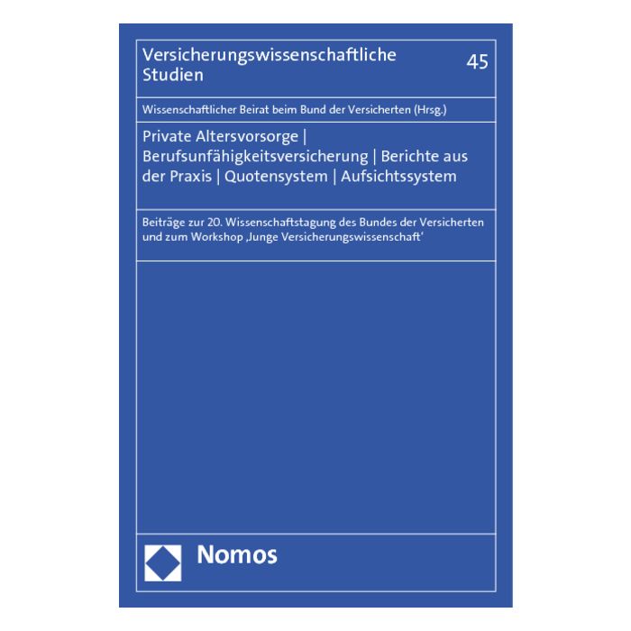 Der Band enthält die Beiträge zur 20. Wissenschaftstagung des Bundes der Versicherten vom 14. bis 16. April 2010 in Timmendorf. Die Tagung wurde mit dem Workshop „Junge Versicherungswissenschaft“ eingeleitet. Der erste Teil beschäftigte sich mit der privaten Altersvorsorge und der Berufsunfähigkeitsversicherung. In den Berichten aus der Praxis werden die datenschutzrechtlichen Neuordnungen und die Auswirkungen auf das Uniwagnis-System aufgezeigt. Neben einem Bericht des Versicherungsombudsmanns ist ein Beitrag zu den Erfahrungen des Ombudmanns Private Kranken- und Pflegeversicherung enthalten. Ein weiterer Themenschwerpunkt betrifft das neue Quotensystem und das Versicherungsaufsichtsrecht.