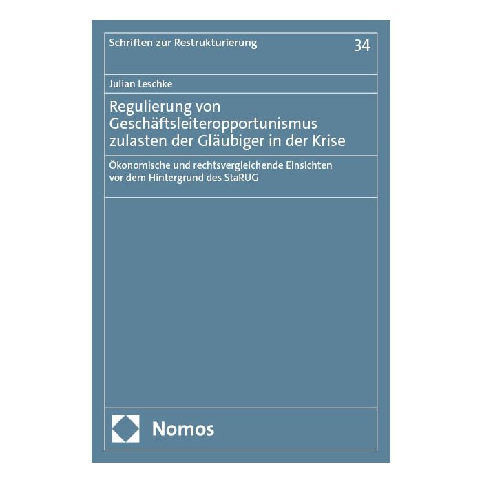 Vor dem Hintergrund des Restrukturierungsrechts untersucht das Werk das unternehmerische Risikoverhalten und Geschäftsleiteropportunismus in Krisensituationen. Basierend auf einer Analyse ökonometrischer Daten wird vorgeschlagen, den Begriff der „Gläubigerinteressen“ weniger an der Gefahr risikoreichen Handelns von Geschäftsleitern (sog. gambling for resurrection) auszurichten. Stattdessen zeigt eine Betrachtung der gesellschaftsrechtlichen Treuepflicht sowie eine Analyse des englischen Case Law zu Geschäftsleiterpflichten in Krisensituationen, dass die Regulierung von Zahlungsströmen aus der Gesellschaft im Zentrum der Auslegung stehen sollte.
