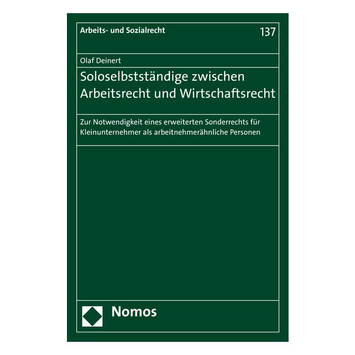Olaf Deinert untersucht ausführlich den sozialen Schutz kleiner Selbstständiger, die keine eigenen Arbeitnehmer beschäftigen (Soloselbstständige). Dabei wird nicht nur das Recht der arbeitnehmerähnlichen Personen in den Blick genommen, sondern auch sonstige bürgerlichrechtliche Bestimmungen. Dieser Schutz wird dem Schutz von Arbeitnehmern gegenübergestellt und mit diesem verglichen. Auch neue Erscheinungen wie Crowdwork werden in den Blick genommen. Am Ende wird eine Neubestimmung des Begriffs der arbeitnehmerähnlichen Person vorgeschlagen, die auch durch die Rechtsprechung bewerkstelligt werden könnte, um einen sachgerechteren sozialen Schutz wirtschaftlich abhängiger Personen zu erreichen.