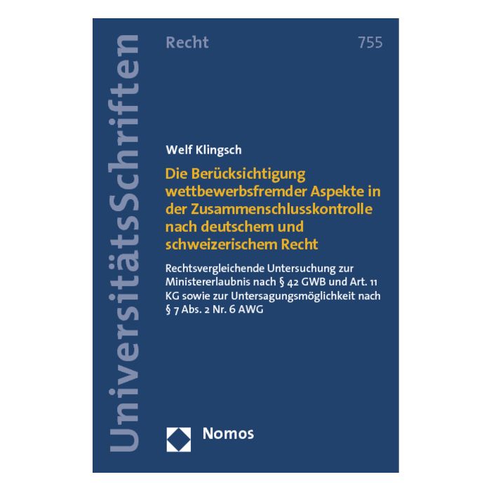 | Subtitle | Rechtsvergleichende Untersuchung zur Ministererlaubnis nach § 42 GWB und Art. 11 KG sowie zur Untersagungsmöglichkeit nach § 7 Abs. 2 Nr. 6 AWG |