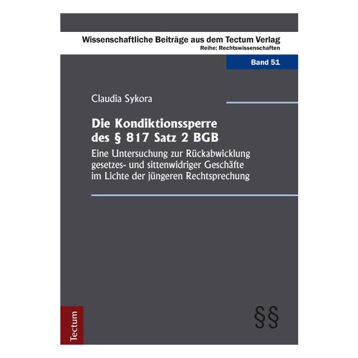 Der Kondiktionsausschluss bei Gesetzes- oder Sittenverstoß des Leistenden ist eine im Rechtsalltag äußerst relevante Vorschrift des Bereicherungsrechtes. Bei Urteilen des Bundesgerichtshofs zur Schwarzarbeit oder sittenwidrigen Schenkkreisen spielte sie in jüngerer Vergangenheit eine Rolle. Die interpretationsbedürftige Vorschrift des § 817 Satz 2 BGB hat zudem bereits zahlreiche Wissenschaftler beschäftigt. Dabei liegt ihr ein römischer Rechtsgrundsatz zugrunde, der seit 1900 unverändert im BGB enthalten ist. Claudia Sykora sucht für mehr Rechtssicherheit auf der Basis publizierter Lehrmeinungen sowie anhand konkreter Rechtsfälle nach allgemeingültigen Kriterien zur Anwendung der strittigen Rechtsvorschrift. Dabei liegt ein Schwerpunkt auf der Analyse der neueren Rechtsprechung. Ein internationaler Rechtsvergleich zur Handhabung der Rückforderungssperre in der Schweiz, in Österreich sowie in England rundet die Untersuchung ab.