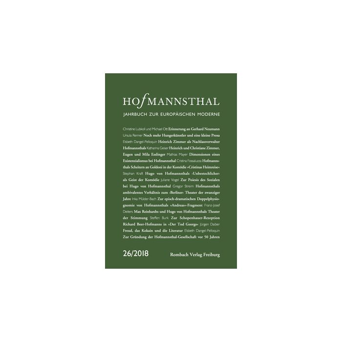 Das Hofmannsthal-Jahrbuch ist weltweit das wichtigste Organ der Hofmannsthal-Forschung. Es bietet neben der Veröffentlichung bisher unpublizierter Briefwechsel Beiträge namhafter Wissenschaftler zur europäischen Kultur der Moderne. Inhalt: - Christine Lubkoll / Michael Ott: in memoriam Gerhard Neumann - Noch mehr Hungerkünstler und eine kleine Prosa. Mitgeteilt von Ursula Renner - Elsbeth Dangel-Pelloquin: »Wunderbare Fügung«. Heinrich Zimmer als Nachlassverwalter Hofmannsthals - Katharina Geiser: Geschichten wie aus dem Roman. Heinrich und Christiane Zimmer, Eugen und Mila Esslinger - Mathias Mayer: Die Komik des Scheiterns. Dimensionen eines Existenzialismus bei Hofmannsthal - Cristina Fossaluzza: »Ein Hauch von Mystizismus«: Hofmannsthals Scheitern an Goldoni in der Komödie »Cristinas Heimreise« - Steffen Burk: Die Welt als Wille und Vorstellung: Zur Schopenhauer-Rezeption Richard Beer-Hofmanns in »Der Tod Georgs« - Franz-Josef Deiters: »gebrochenen Zuständen ein ungebrochenes Weltverhältnis gegenüberzustellen« – Max Reinhardts und Hugo von Hofmannsthals Theater der Stimmung - Jürgen Daiber: Therapeutisches Scheitern: Freud, das Kokain und die Literatur - Inka Mülder-Bach: »Das geht gut«, »das wird gut«: Dynamiken des Scheiterns im »Andreas«-Fragment - Gregor Streim: »Ausgleich von Revolution und Tradition«. Hofmannsthals ambivalentes Verhältnis zum ›Berliner‹ Theater in den zwanziger Jahre - Stephan Kraft: Hugo von Hofmannsthals »Unbestechlicher« als Geist der Komödie - Juliane Vogel: Komische Schwärme. Zur Poiesis des Sozialen bei Hugo von Hofmannsthal - Elsbeth Dangel-Pelloquin: Hofmannsthal 1968. Zur Gründung der Hofmannsthal-Gesellschaft vor 50 Jahren