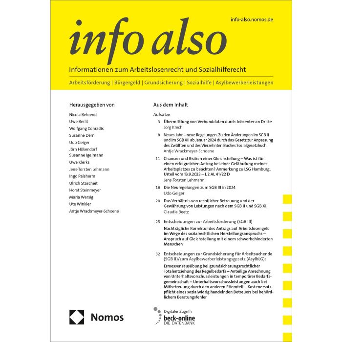 Die info also ist die einzige Zeitschrift, die sich auf das Arbeitslosen- und Sozialhilferecht konzentriert. Sie dokumentiert profund und auf das Wesentliche komprimiert alle relevanten Entwicklungen in diesem Bereich mit Aufsätzen zu rechtlichen Fragestellungen Kurzkommentaren und Gerichtsentscheidungen. Neben den höchstrichterlichen Entscheidungen, die oftmals nur ein begrenztes Bild vermitteln, werden auch die Entscheidungen der ersten Instanzen berücksichtigt. Darüber hinaus informiert die info also über Gesetzesentwürfe und Verordnungen.