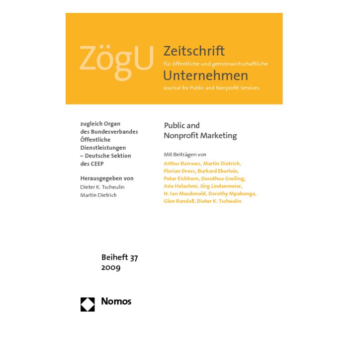 Das Beiheft 37 der ZögU widmet sich diesem Gebiet mit Aufsätzen zum Thema der Anwendung von Marketing und marktorientierten Managementansätzen im Public und Nonprofit Management. In diesem Beiheft werden unter anderem Aspekte und Methoden zur Bestimmung von Preisbereitschaften, Public-Private-Partnerships als besondere Form des marktorientierten Managements in öffentlichen Organisationen und weitere, auch aus dem internationalen Umfeld stammende Anwendungsgebiete dargestellt und erörtert.