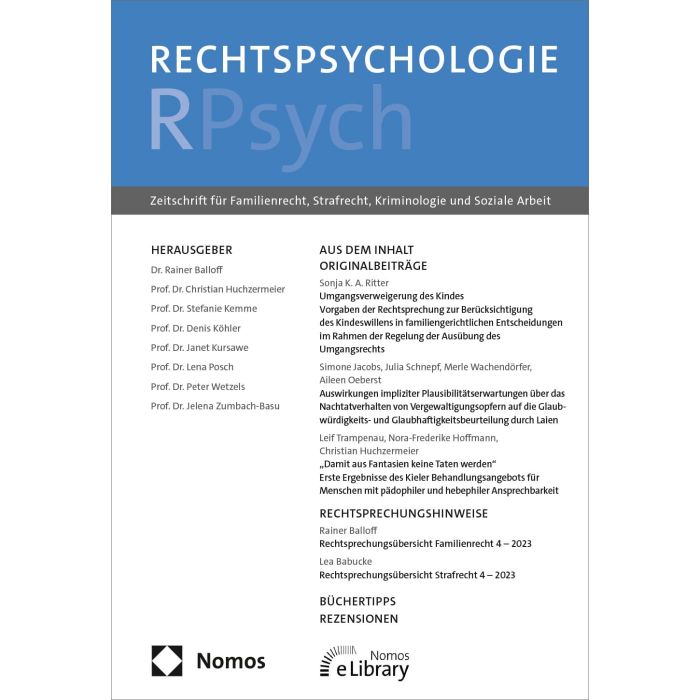 Die interdisziplinäre Zeitschrift „Rechtspsychologie – RPsych“ bietet ein wissenschaftliches Forum für die Rechtspsychologie in Forschung und Praxis und bezieht dabei auch die Nachbardisziplinen ein. Besondere Schwerpunkte liegen im Familienrecht, im Strafrecht und der Kriminologie sowie in der Sozialen Arbeit – also in den Bereichen des Rechts, in denen psychologische Gutachten und Methoden eine besonders große Rolle spielen.