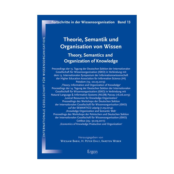 Proceedings der 13. Tagung der Deutschen Sektion der Internationalen Gesellschaft für Wissensorganisation (ISKO) und dem 13. Internationalen Symposium der Informationswissenschaft der Higher Education Association for Information Science (HI) Potsdam (19.–20.03.2013): ‚Theory, Information and Organization of Knowledge‘ | Proceedings der 14. Tagung der Deutschen Sektion der Internationalen Gesellschaft für Wissensorganisation (ISKO) und Natural Language & Information Systems (NLDB) Passau (16.06.2015): ‚Lexical Resources for Knowledge Organization‘ | Proceedings des Workshops der Deutschen Sektion der Internationalen Gesellschaft für Wissensorganisation (ISKO) auf der SEMANTICS Leipzig (1.09.2014): ‚Knowledge Organization and Semantic Web‘ | Proceedings des Workshops der Polnischen und Deutschen Sektion der Internationalen Gesellschaft für Wissensorganisation (ISKO) Cottbus (29.–30.09.2011): ‚Economics of Knowledge Production and Organization‘